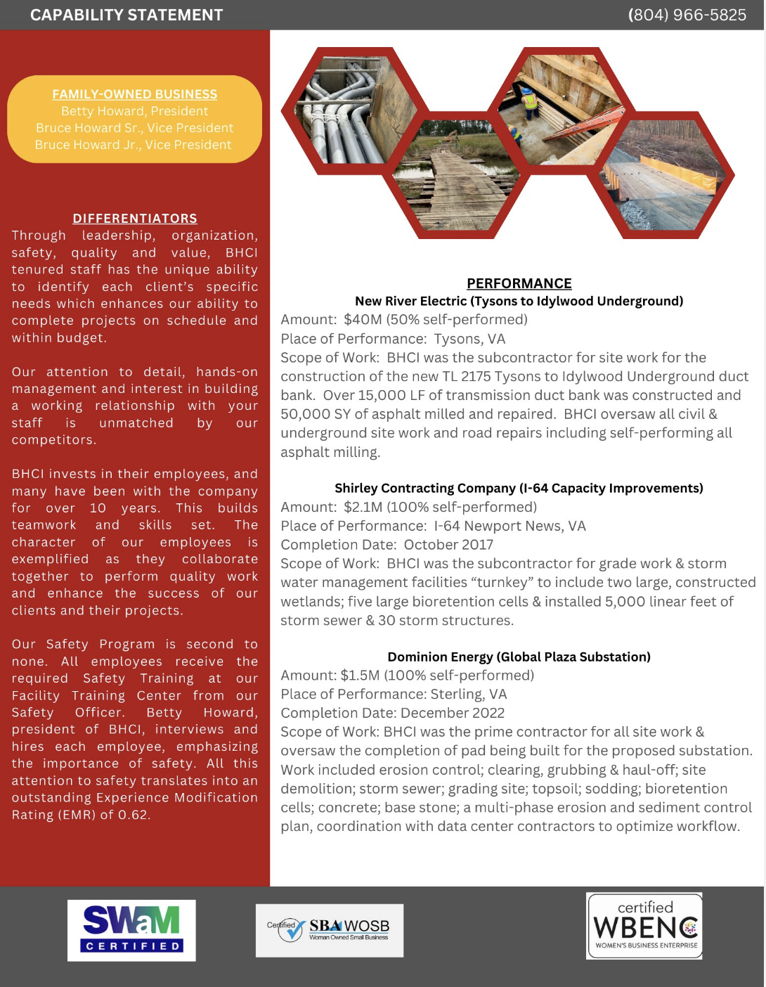 PROJECTSSkiffes Creek | TL 534 Cunningham-Dooms | Charles City County Boat Ramp and Parking Expansion Project | VCU Rice Center Education Building | Bruce Howard Contracting Headquarters | New Kent VDOT Maintenance Facility | DGIF Region 5 Headquarters | Goodwill Industries | New River Electric (Tysons to Idylwood Underground) | Shirley Contracting Company (I-64 Capacity Improvements | Dominion Energy (Global Plaza Substation)